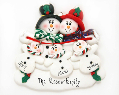 This personalized snowman family ornament has 3 kids that dangle on a bright red ribbon, representing a family with 3 children or even grandparents with 3 grandchildren